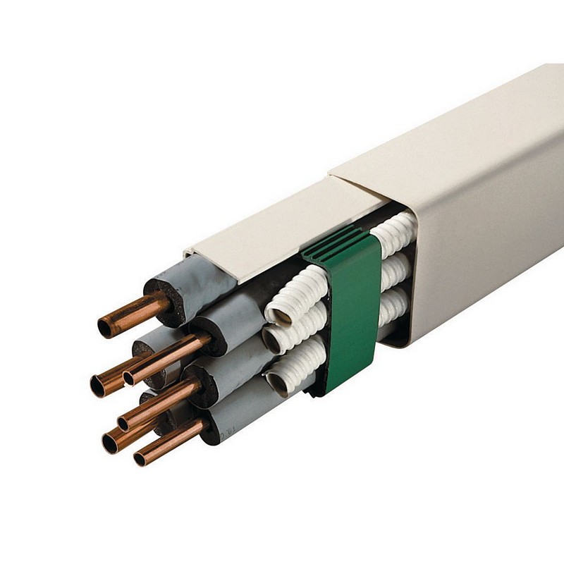 Grâce à sa section généreuse, la goulotte permet d’accueillir aisément câbles, gaines et tubes de climatisation.