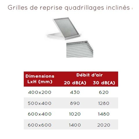 | Dimensions (mm) | Débit d’air (m³/h) | Niveau sonore (dB(A)) |