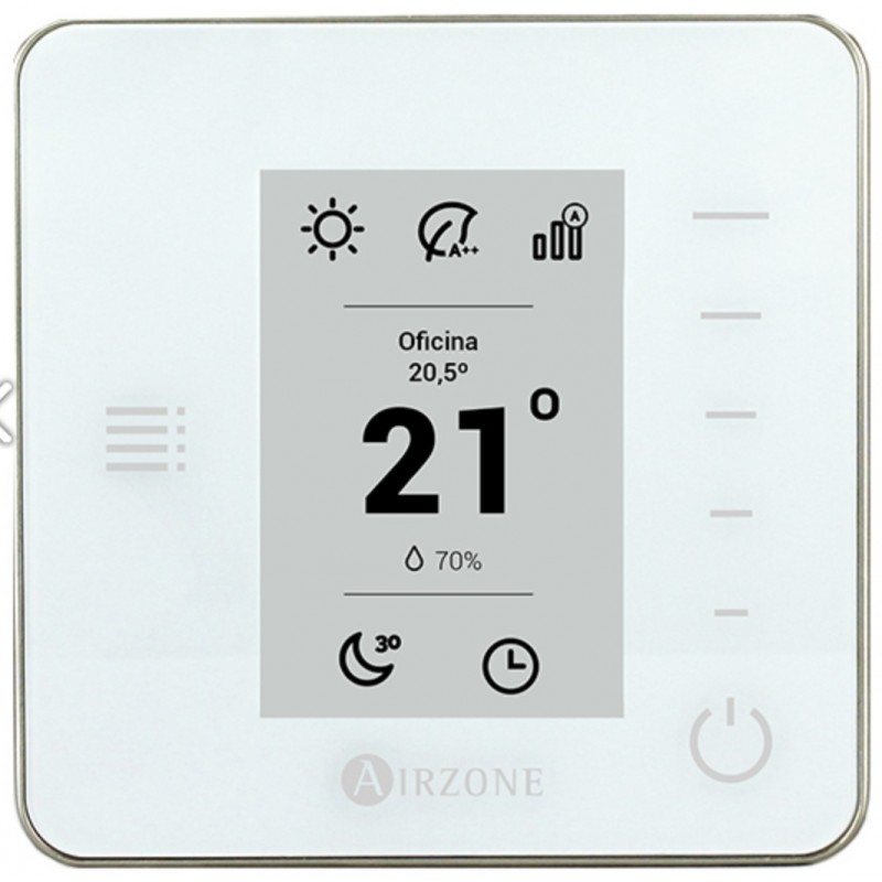 Le thermostat Think Airzone allie technologie et élégance pour une régulation optimale de votre système Airzone. Il est doté d’une interface graphique moderne avec affichage à encre électronique à faible consommation, garantissant une lisibilité claire et une efficacité énergétique accrue. Ses boutons capacitifs et sa finition en acier et verre trempé ajoutent une touche de sophistication à votre espace.